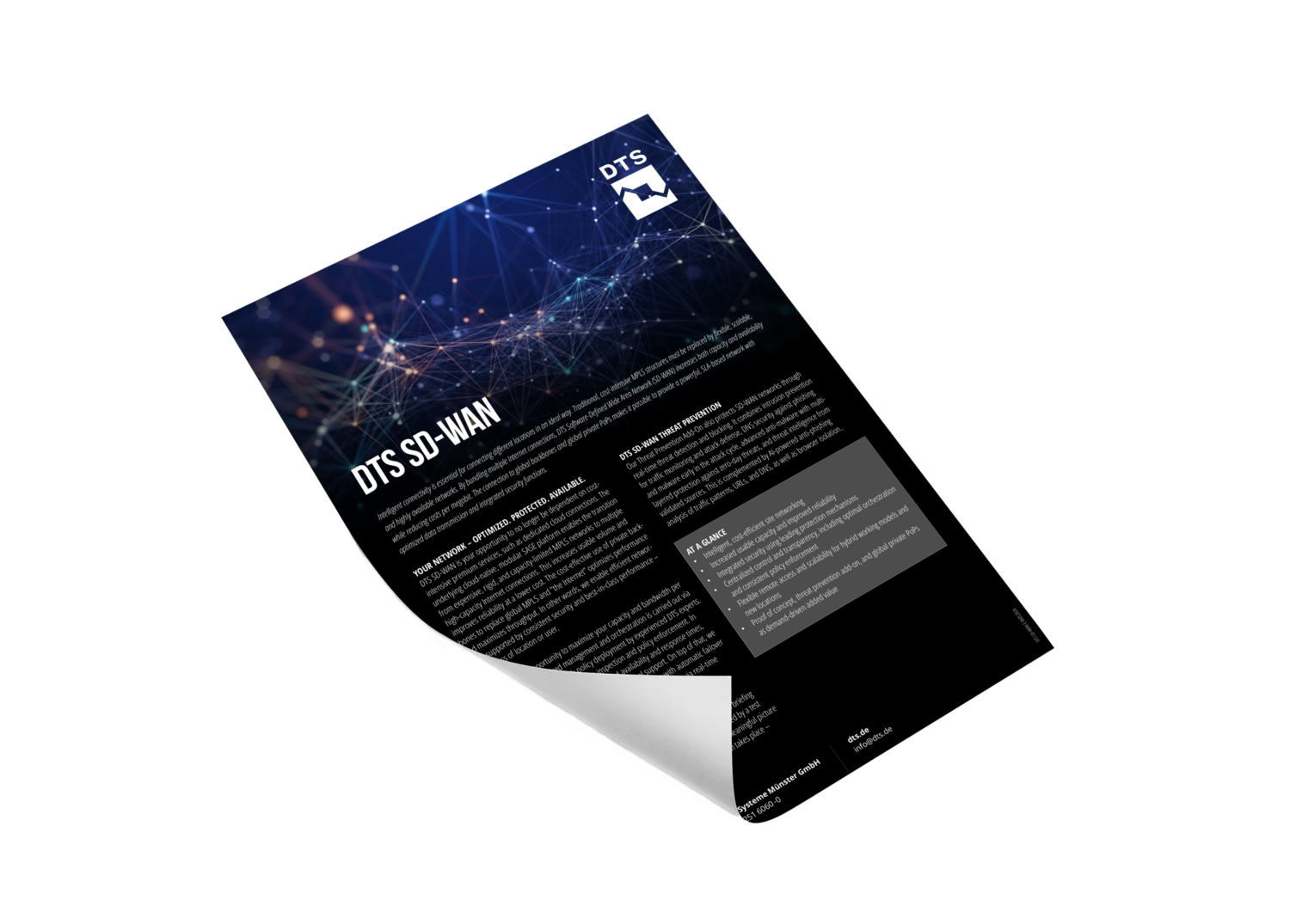 Intelligent connectivity is essential for connecting different locations in an ideal way. Traditional, cost-intensive MPLS structures must be replaced by flexible, scalable, and highly available networks. By bundling multiple Internet connections, DTS Software-Defined Wide Area Network (SD-WAN) increases both capacity and availability while reducing costs per megabit. The connection to global backbones and global private PoPs makes it possible to provide a powerful network with optimized data transmission and integrated security functions. DTS SD-WAN enables efficient networking, supported by consistent security and best performance – regardless of location or user.